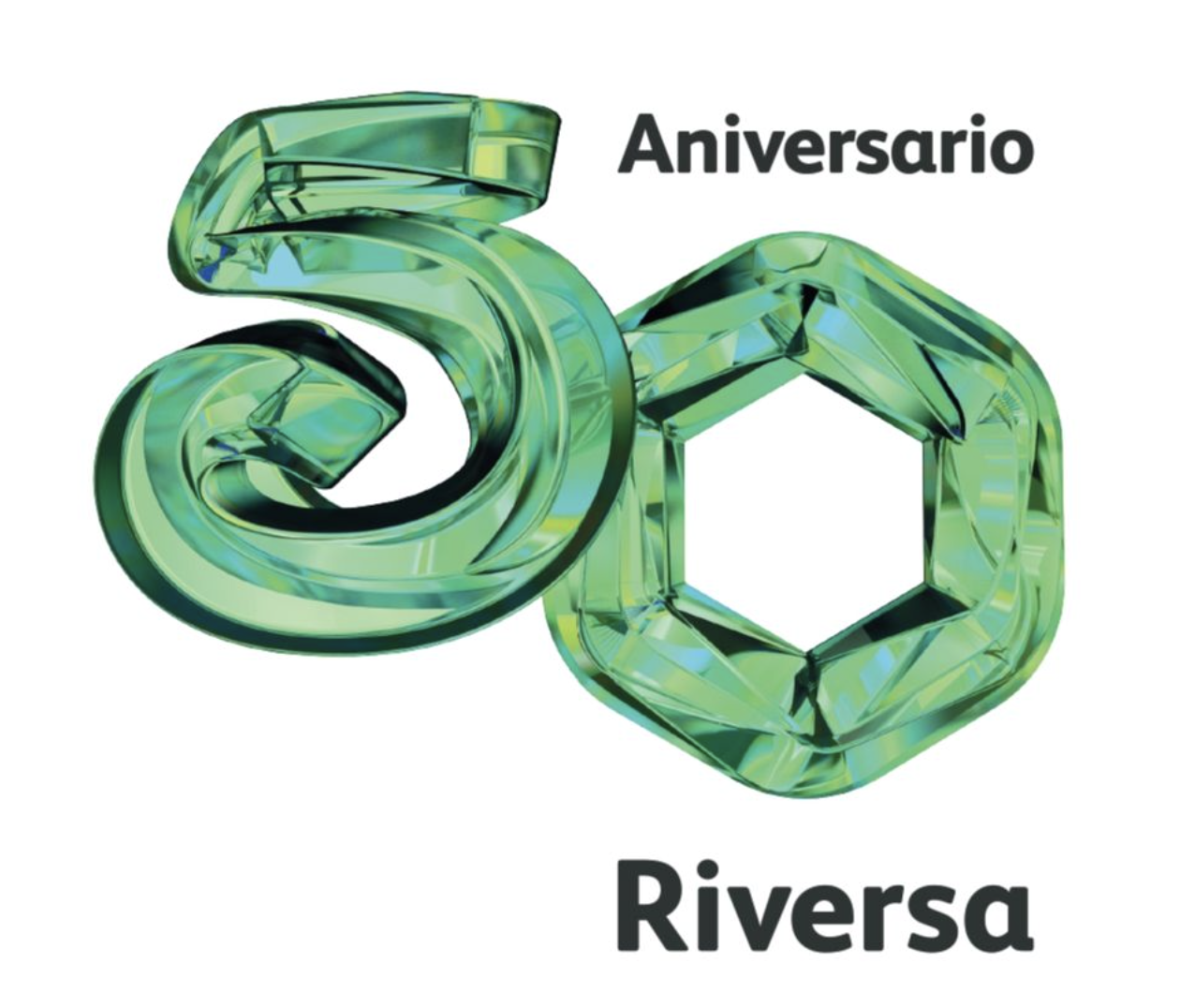 Para diseñar el logo del 50 aniversario, Riversa ha decidido mantener los verdes y azules de la gama cromática tan representativa de la marca y articular el cero del 50 sobre el hexágono que simboliza la armonía, el equilibrio, la unidad y la interconexión de elementos césped y agua.